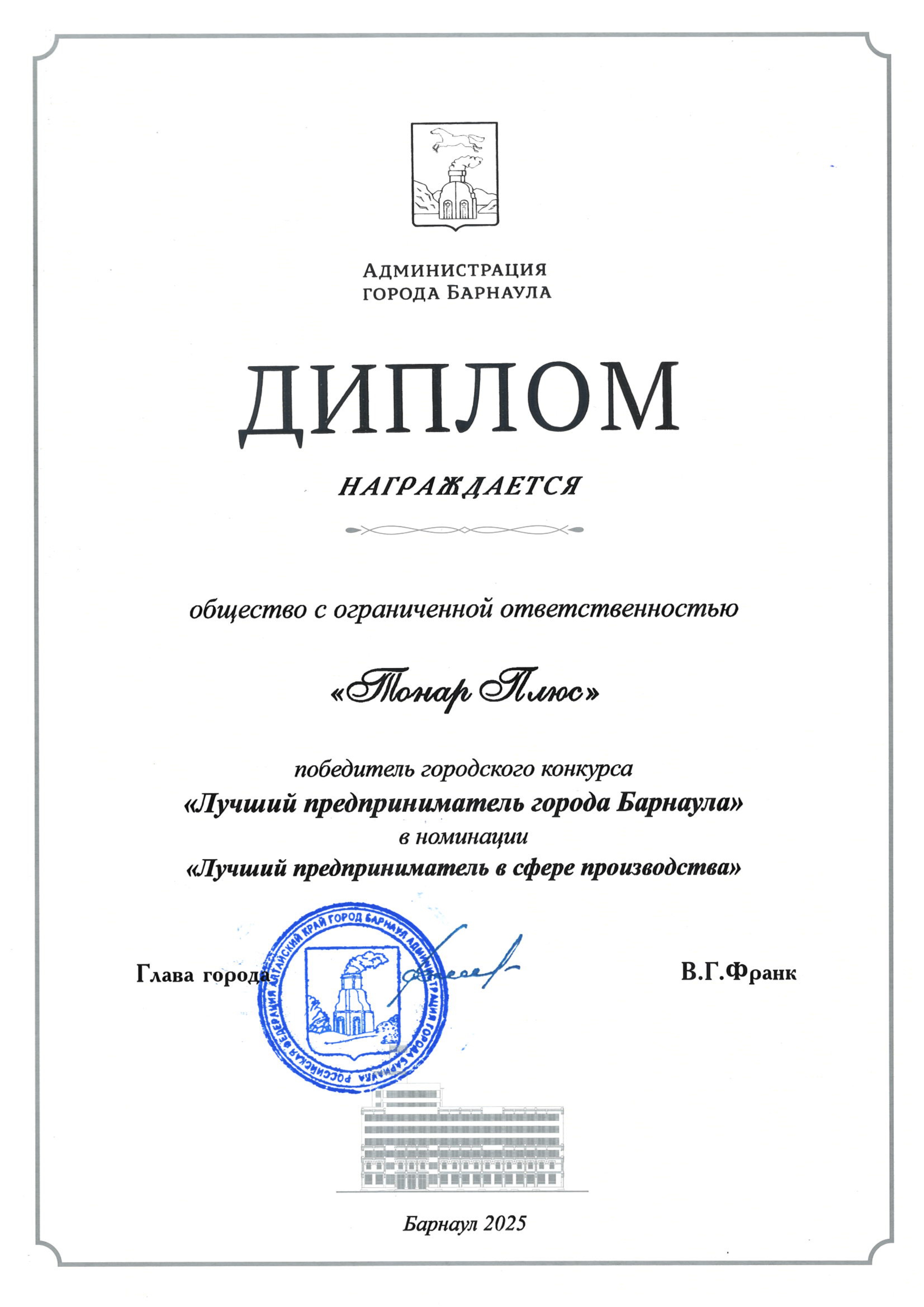 Предприятие ООО «Тонар Плюс» стало победителем конкурса «Лучший предприниматель города Барнаула», получив высшую оценку жюри в номинации «Лучший предприниматель в сфере производства».