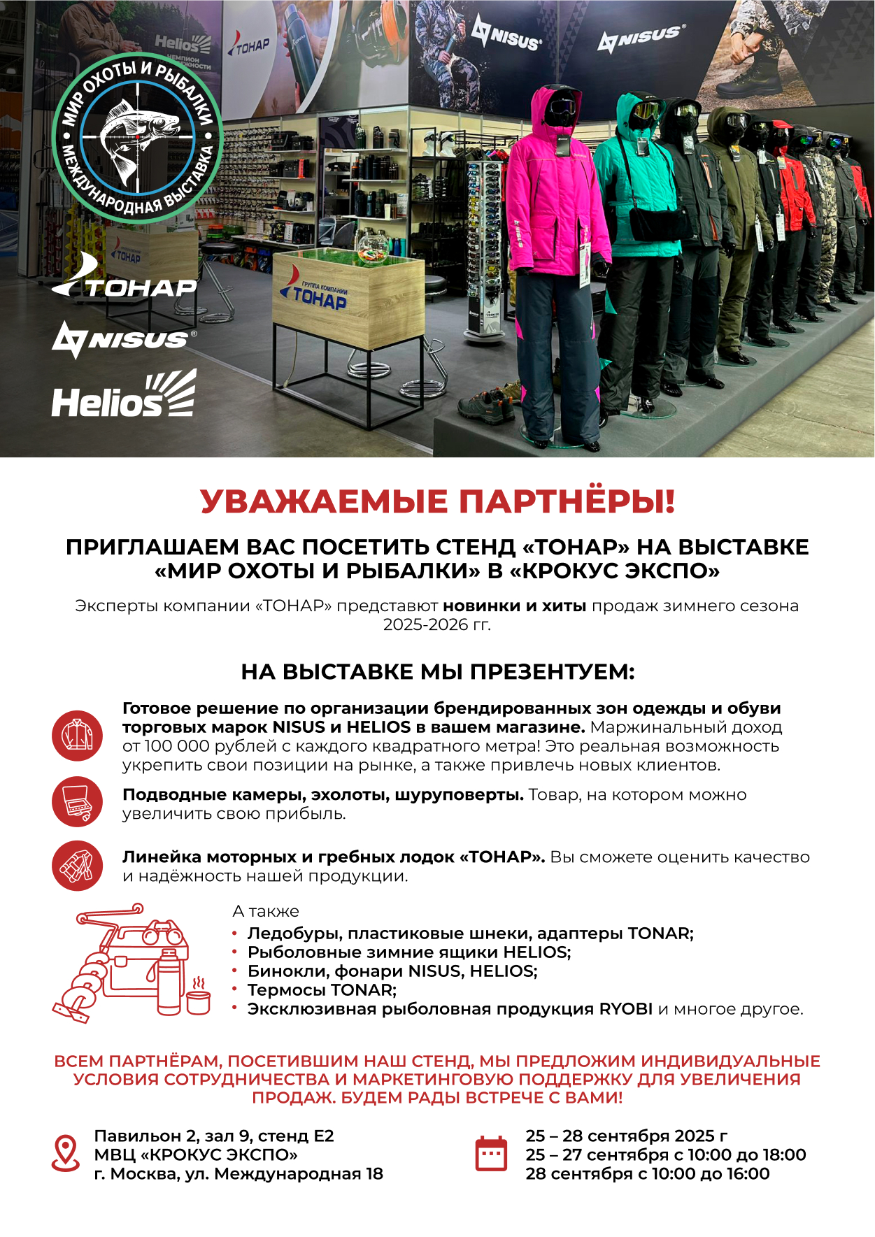 Уважаемые партнеры, приглашаем Вас посетить стенд компании ТОНАР на выставке «Мир Охоты и Рыбалки», которая пройдет в «Крокус Экспо» с 25 по 28 сентября 2025 года!