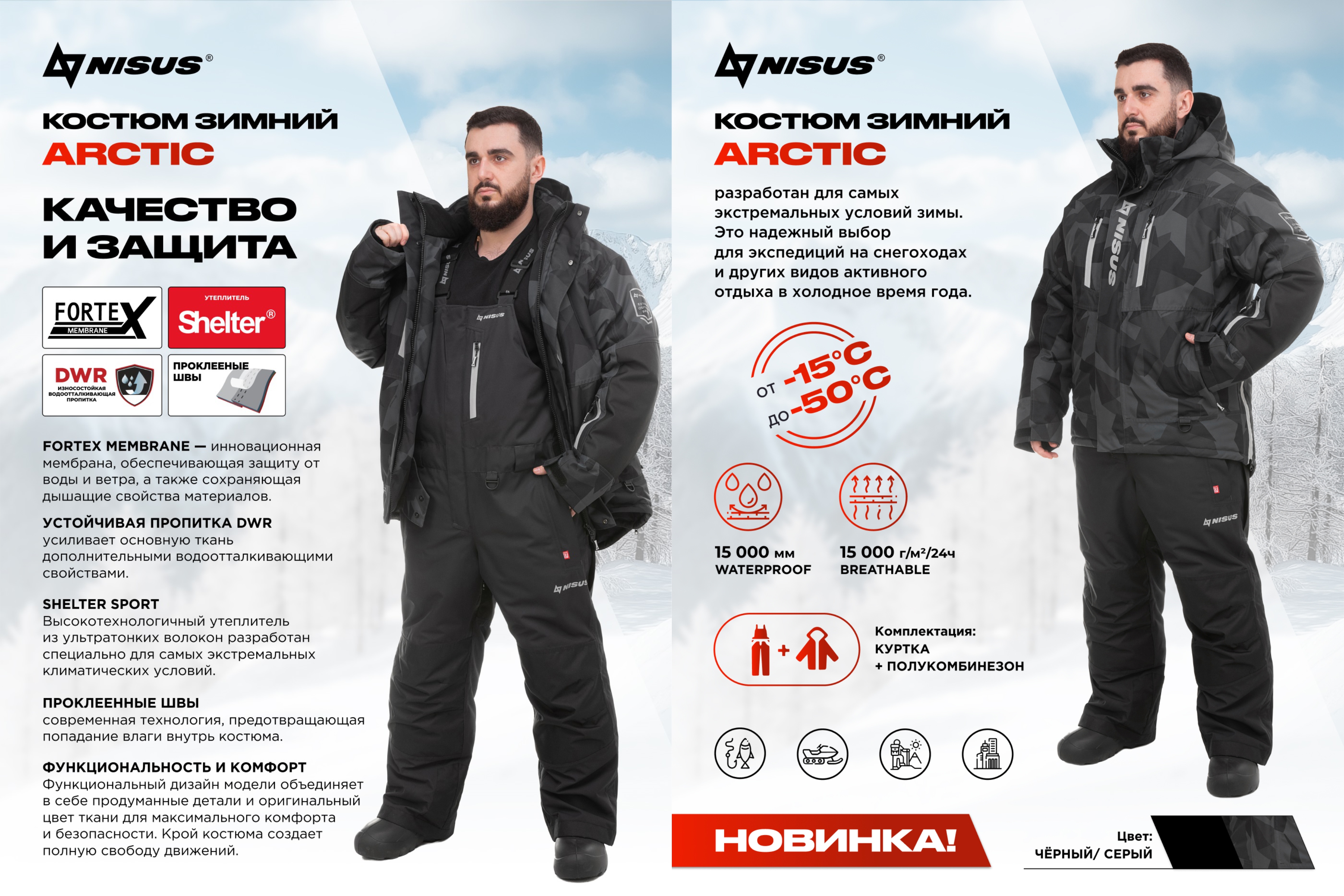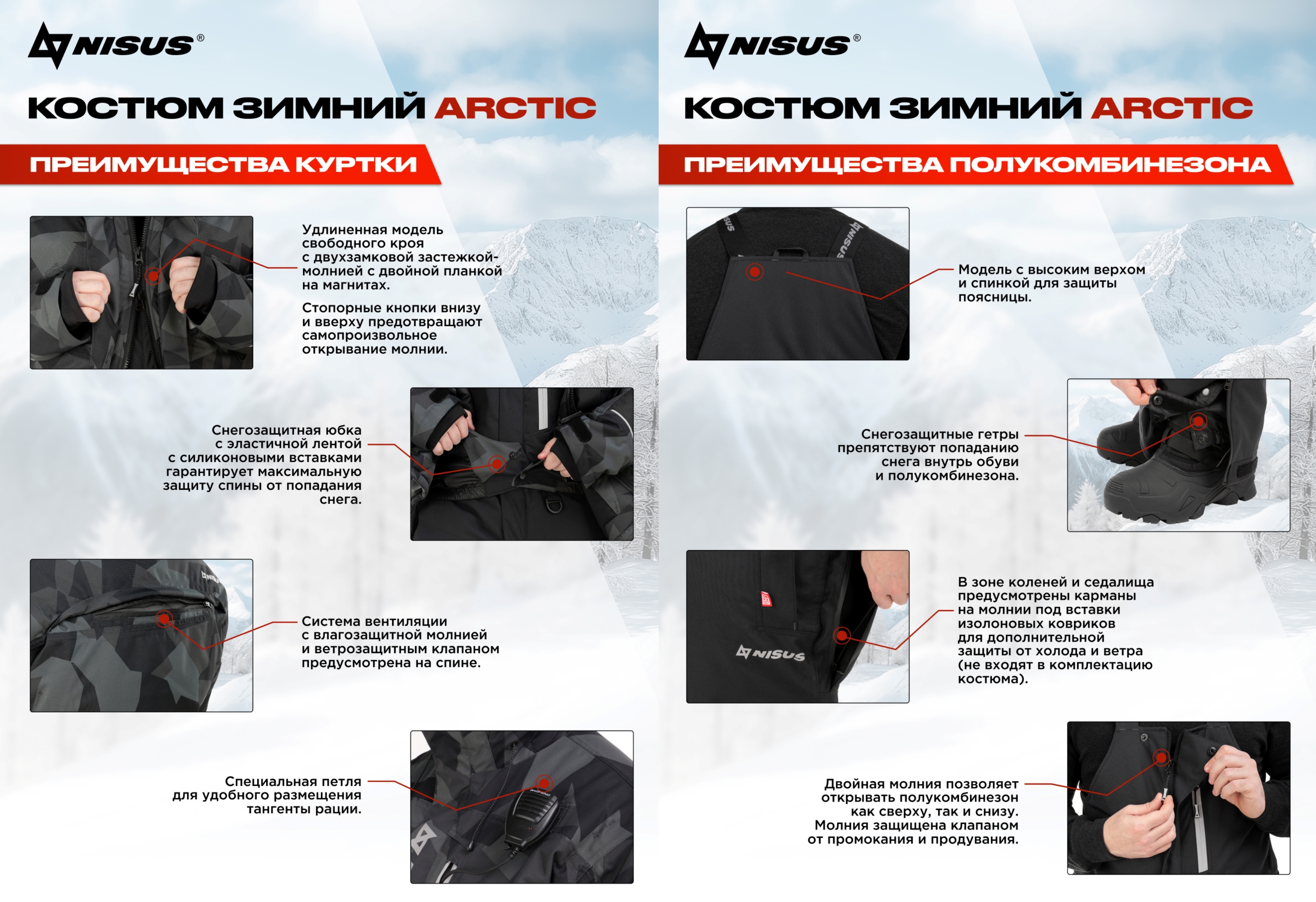 Костюм ARCTIC бренда NISUS — это пример современного подхода к созданию специализированной одежды с учетом экстремальных погодных условий. Костюм сочетает в себе функциональность, технологические инновации и современный дизайн.