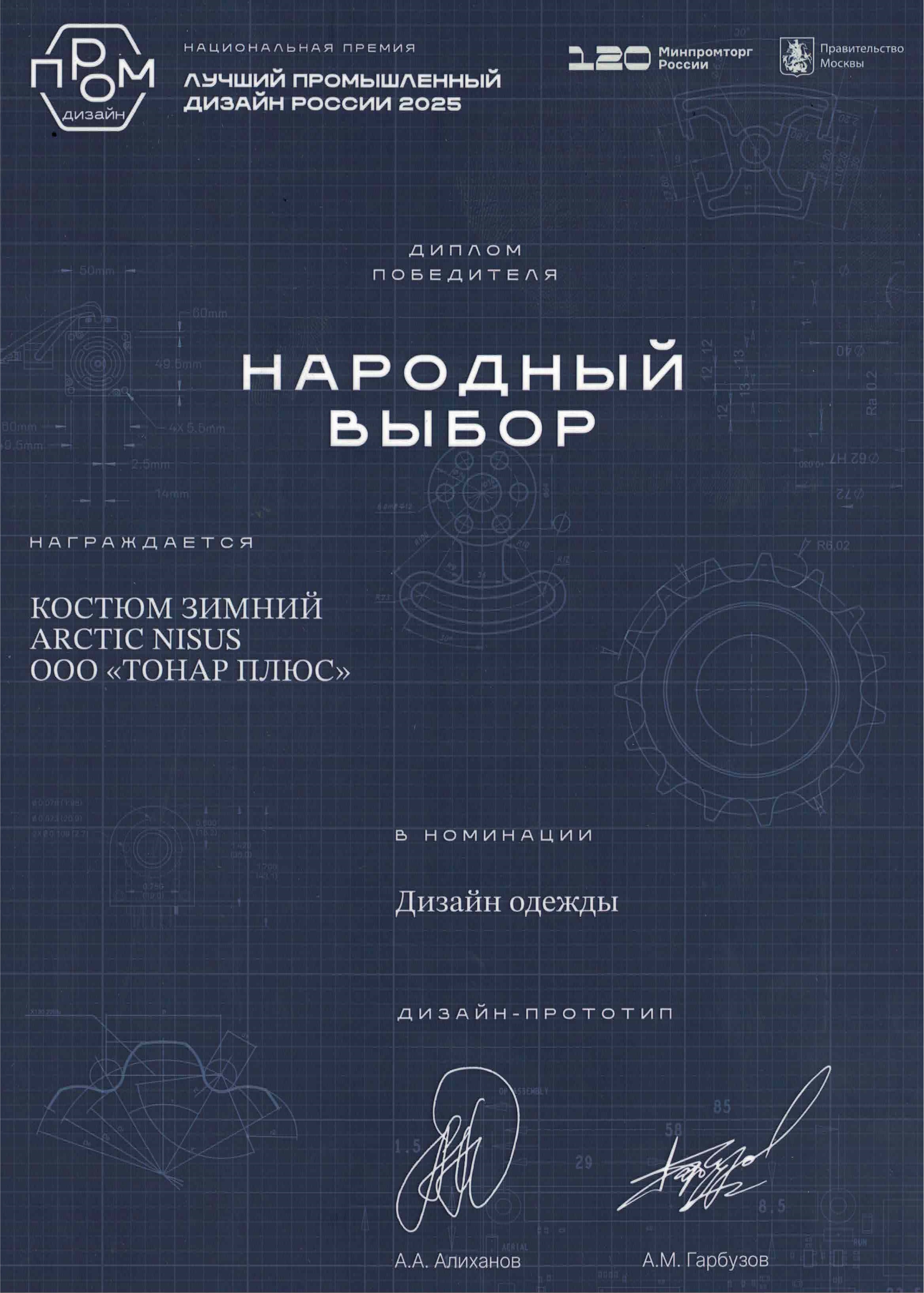По итогам народного голосования были вручены 25 наград в номинации «Народный выбор», в том числе компания ТОНАР была удостоена награды за костюм зимний ARCTIC бренда NISUS, отмеченный как один из самых ярких и актуальных дизайн-прототипов текущего года.