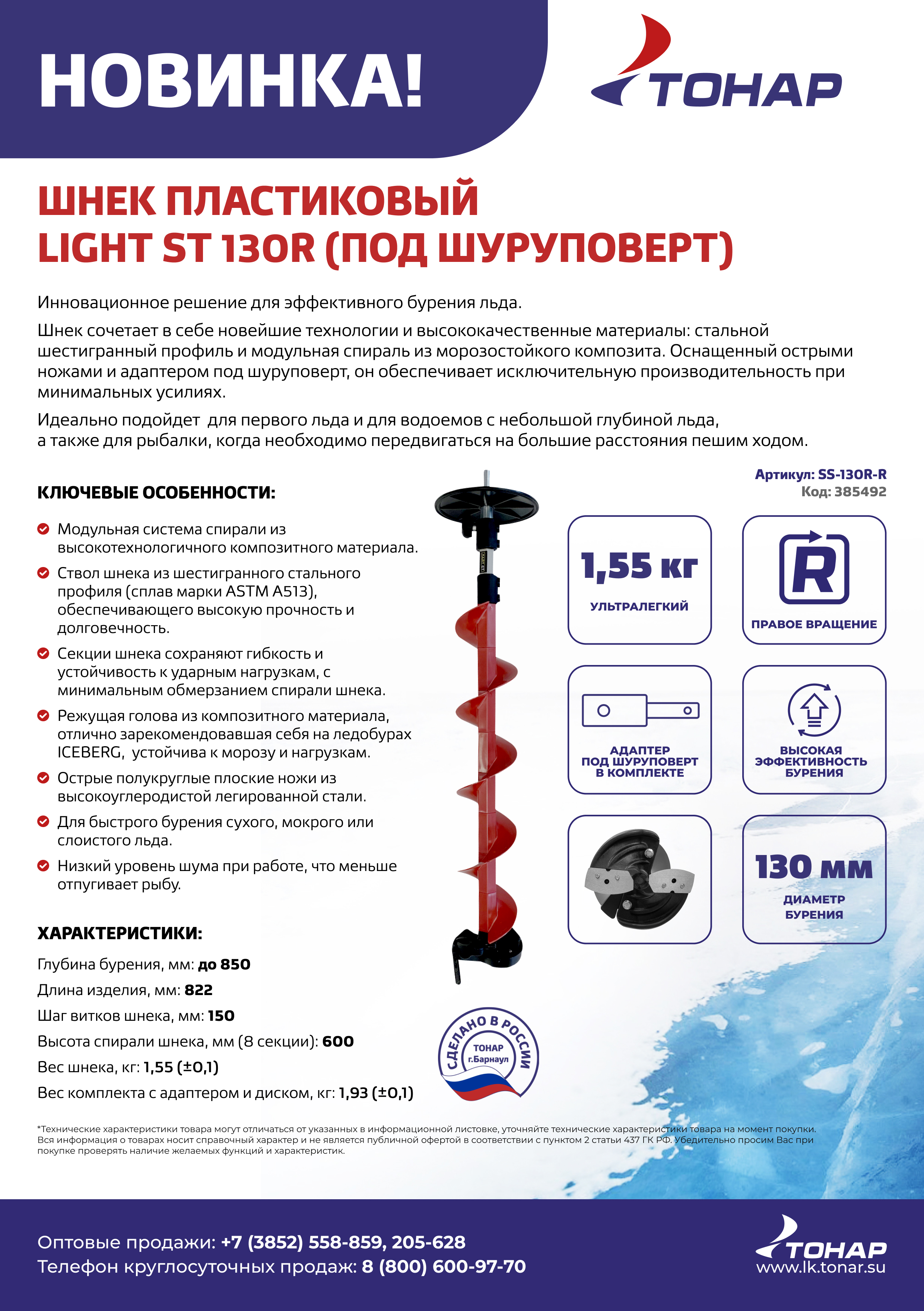 Шнек LIGHT ST 130R (ЛАЙТ СТ) от компании ТОНАР имеет надежную стальную ось и пластиковую спираль и оснащен удобным адаптером под шуруповерт с ограничительным диском, исключающим падение шнека в лунку в случае самопроизвольного отсоединения от патрона шуруповерта. Благодаря такой комплектации, рыболов сможет сразу же приступить к бурению, необходимо только присоединить шнек к шуруповёрту.